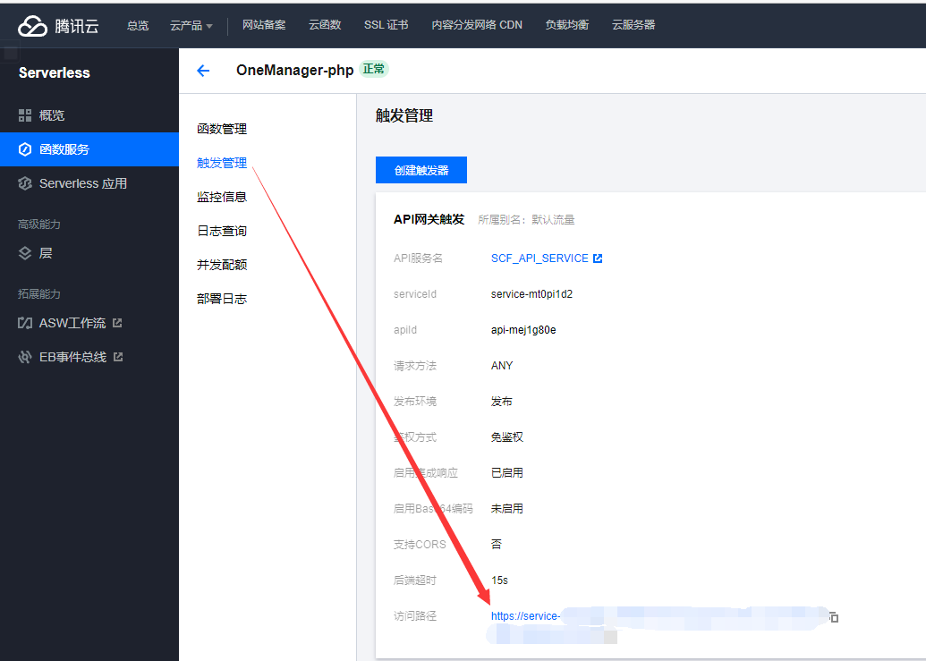选择触发管理,点击SCF_API_SERVICE,点击自定义域名,新建自定义域名,没有证书的话选择http协议