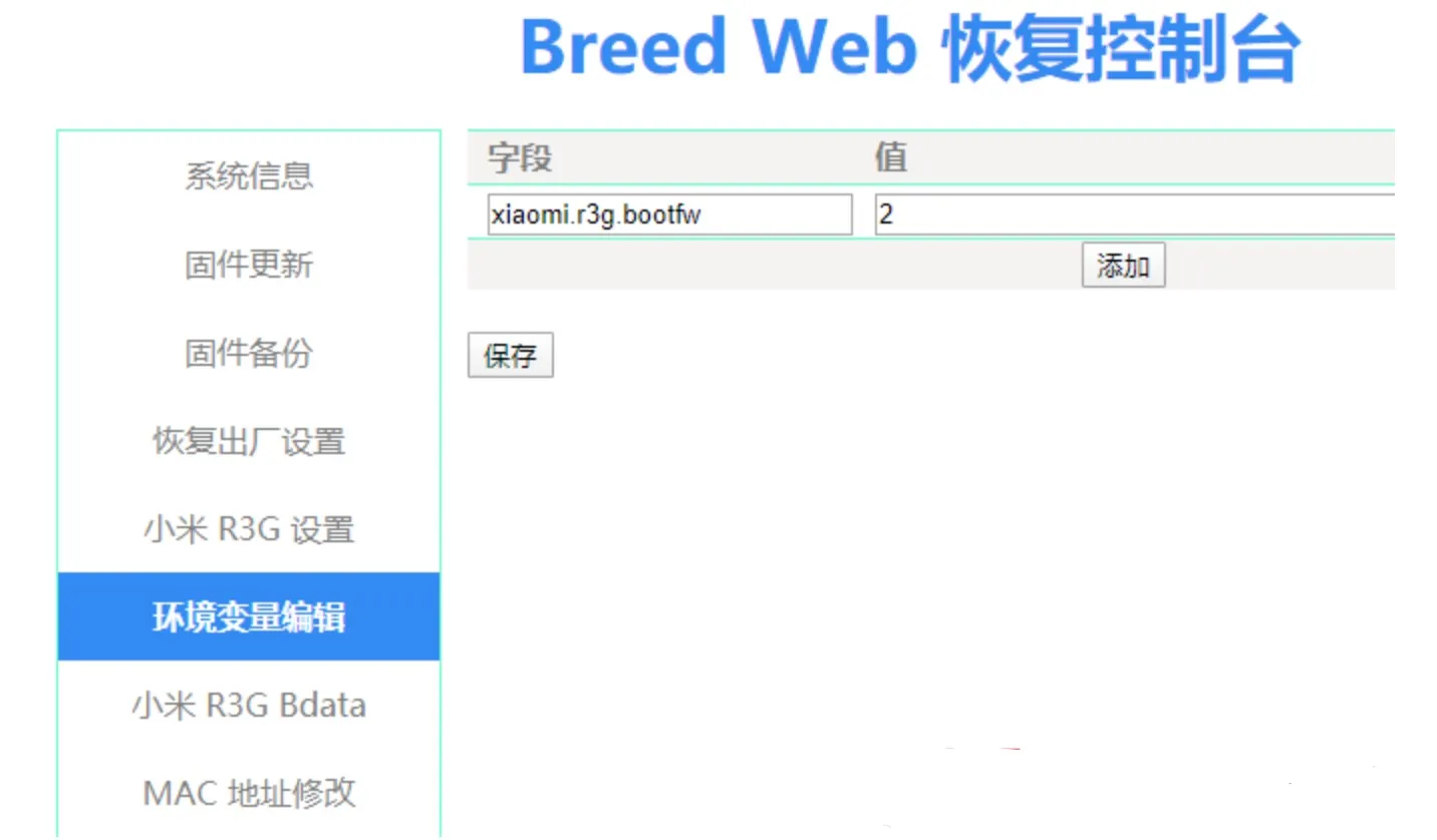 更改环境变量,编缉,新增字段xiaomi.r3g.bootfw,值设置为 2,然后保存。