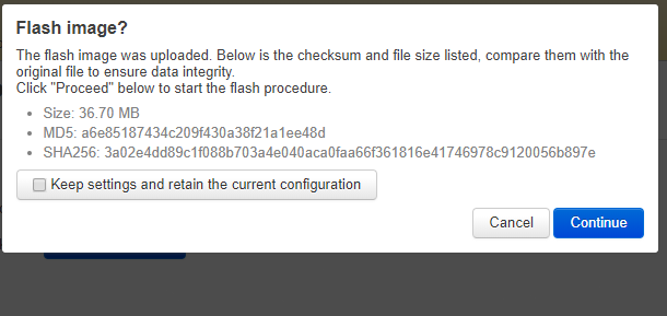 不要勾选 Keep settings and retain the current configuration,最后点Continue,等几分钟让路由器自己重启。进入新固件。