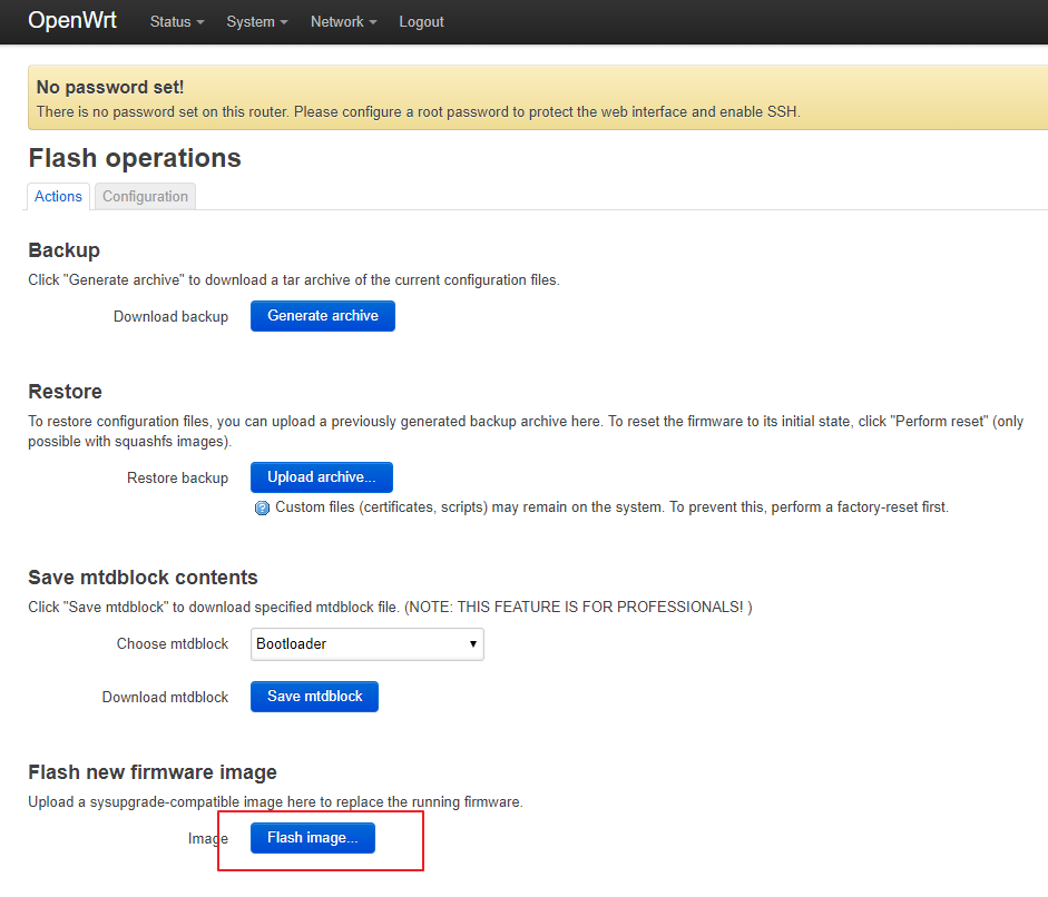 对应的菜单是System -> Backup / Flash Firmware),点击 Flash image… 上传想刷的Openwrt固件